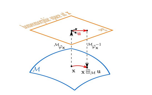 - A sphere is a manifold. Any two points on a sphere cannot produce another point on the sphere. However, at any point on the sphere, there’s a tangent plane where any two points there could add up to a point on the same plane (using the local coordinates there). Then, using some mapping, point addition result on the tangent plane can be projected onto the sphere. We describe that addition as: