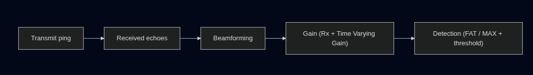 TVG (Time Varying Gain) is a range-dependent gain applied as a function of time. As sound travels farther, its energy spreads out and is absorbed by the water, so distant echoes are much weaker than near ones. TVG compensates for this by applying more gain to later (farther) samples and less gain to earlier (closer) samples. The result is that targets at different ranges become more comparable in amplitude, making a single detection threshold practical across the whole water column.