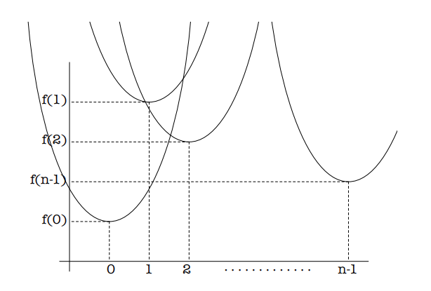 \[D(p) = min_{Q} ((p - q) ^ 2 + f(q)\]The goal is equivalent to finding the lower Envelope of the quadratic functions